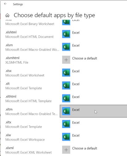 Next to .xltm you should see “Excel” as shown in the screen capture above. If you see “Choose a default” or some other application, then you need to click on the image/text in the right column. A small window opens giving you some options. Select Excel if available. You may have to browse or search for Excel.