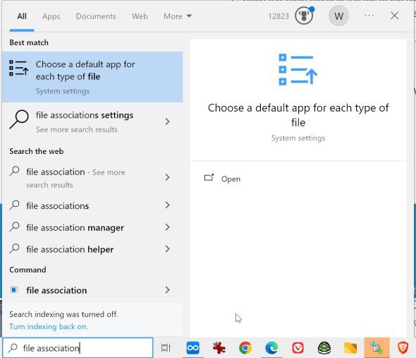 In the lower left corner of your screen where it says “Type Here to Search,” enter the words “file association.” Click on the File Association setting as shown in the screen capture below: