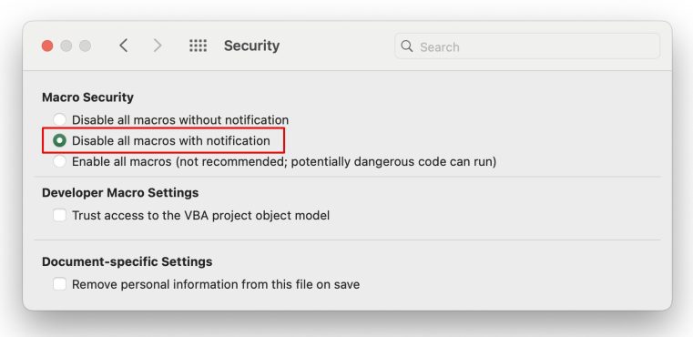 If you do not see this window when opening RealData files, be sure to first check your macro security setting in Excel. First click on “Excel” in the upper left, next to the Apple icon. Now click on “Preferences.” Now click on “Security” – (this will vary depending on the version of your operating system. Select the middle setting under Macro Security which is “Disable all macros with notification” – see the graphic below.