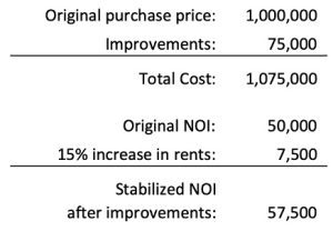You’re thinking of spending $75,000 on improvements so you can bump up rents by 15%. Let’s see how that looks: